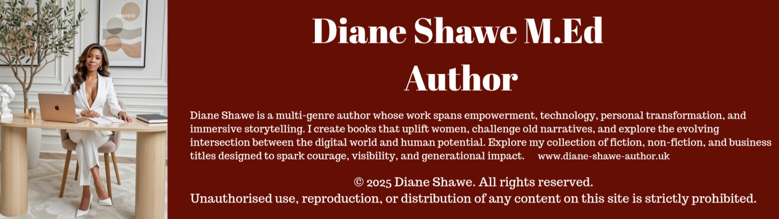 Welcome to the official website of Diane Shawe — author, entrepreneur, educator, and empowerment strategist.My work explores the powerful intersection of technology, personal growth, and human resilience. From fast-paced sci-fi thrillers to transformational guides for women and entrepreneurs, my books are written to inspire confidence, amplify visibility, and ignite personal power.Here you’ll find my latest novels, empowerment books, business resources, and creative projects designed to help readers rise, reclaim their voice, and transform their future.With my latest novels Scrolling Shadows and Sucked into the Deception, I dive into futuristic landscapes where technology, espionage, and human connection collide. These books are a thrilling journey into the digital realm, following a 17-year-old girl’s quest to protect a powerful phone capable of altering reality.